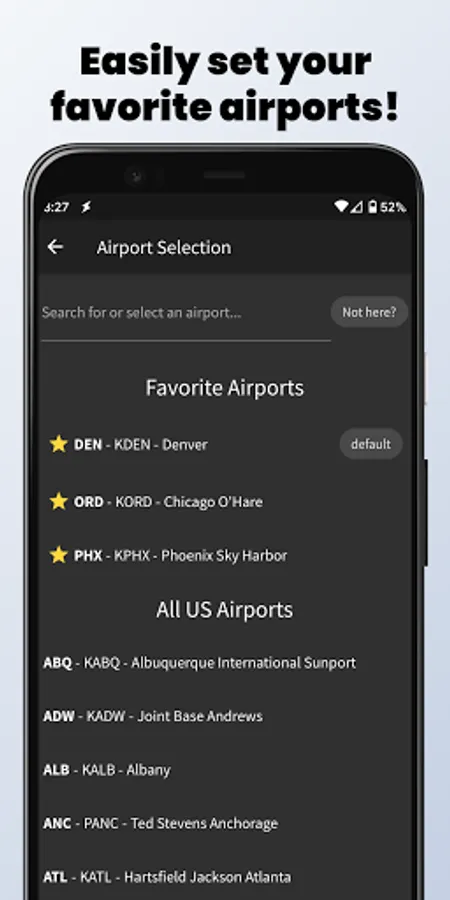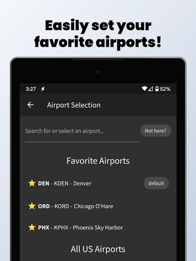 You can easily set a "default" airport that will automatically load whenever you launch the app, and you can favorite multiple airports for easy access to your most frequented airfields.