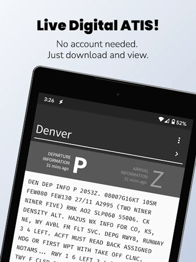 ATIS App allows the live viewing of the most current Digital ATIS, or D-ATIS, information for major airports in the United States. You can view ATIS information with no account or signup required.