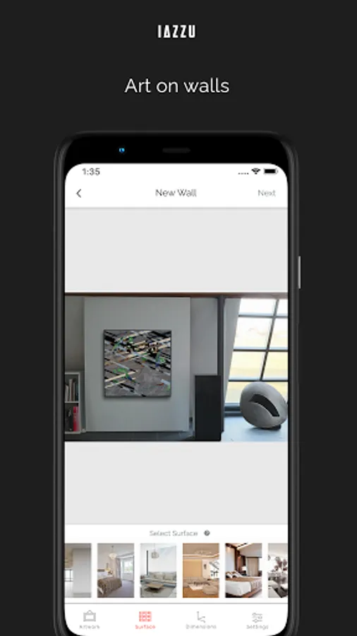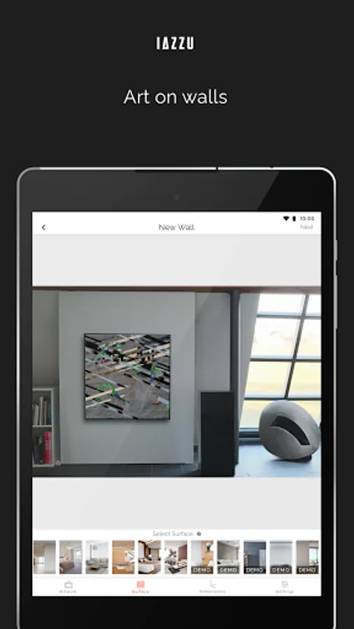 VISUALIZE ART IN YOUR OWN ROOMS: Place the artwork on one of our demo surfaces to get a first impression or upload pictures of your own space to see if a piece incorporates well. Save these visualizations on your camera roll and share them with the world! For live-visualizations, use the Augmented Reality function.