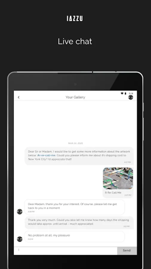 LIVE CHAT WITH EXHIBITORS: Our in-app-chat function allows you to get all your questions answered in real-time, quick and easy, by the person in charge of the artwork you’re interested in.