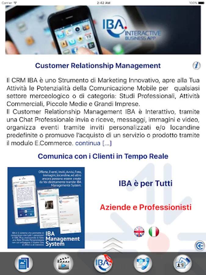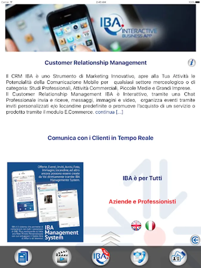 IBA is a very innovative solution to quickly communicate via push-notifications, any kind of information and to manage all users accessing the home network with APP IBA. Providing personal information file of contacts-client functionality of email marketing and massive archive of data shared with each user.