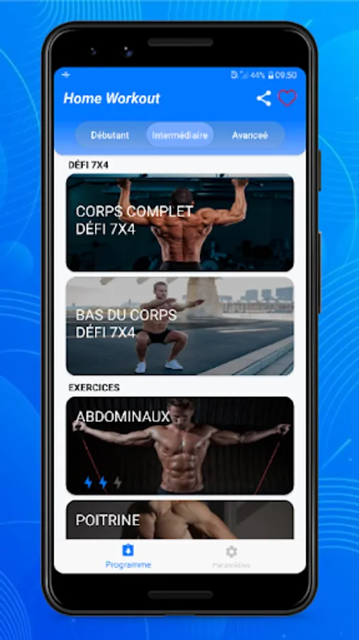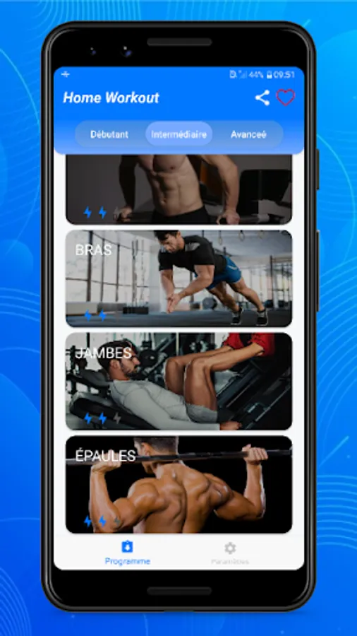 Home Workout offers daily exercise routines for all major muscle groups. In just a few minutes a day, you can develop muscle and stay in shape without having to go to the gym. No equipment or coach needed, all exercises can be done using the weight of your body only.