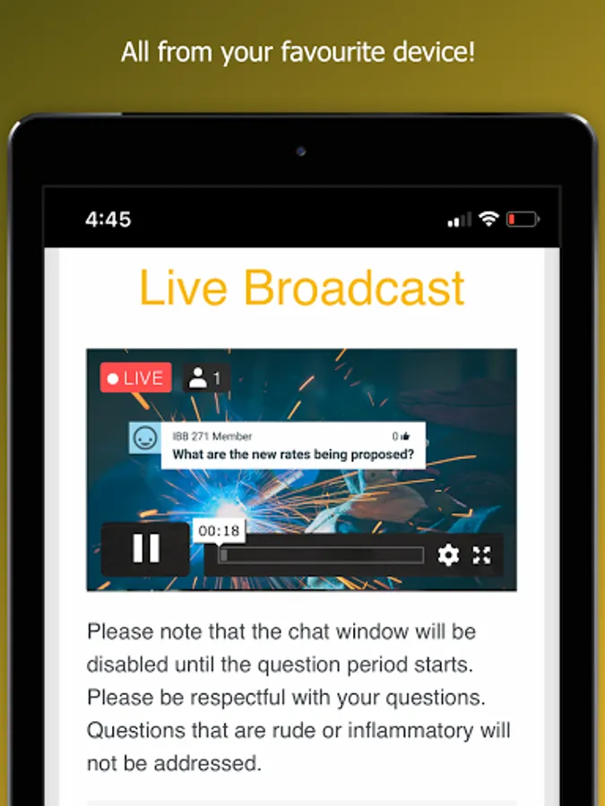 Keep up to date with your Union using the Boilermakers Local 271 live broadcast application. Watch live streaming business manager updates on your mobile device from the comfort of your home. Interact with your Union by asking questions and responding to polls.