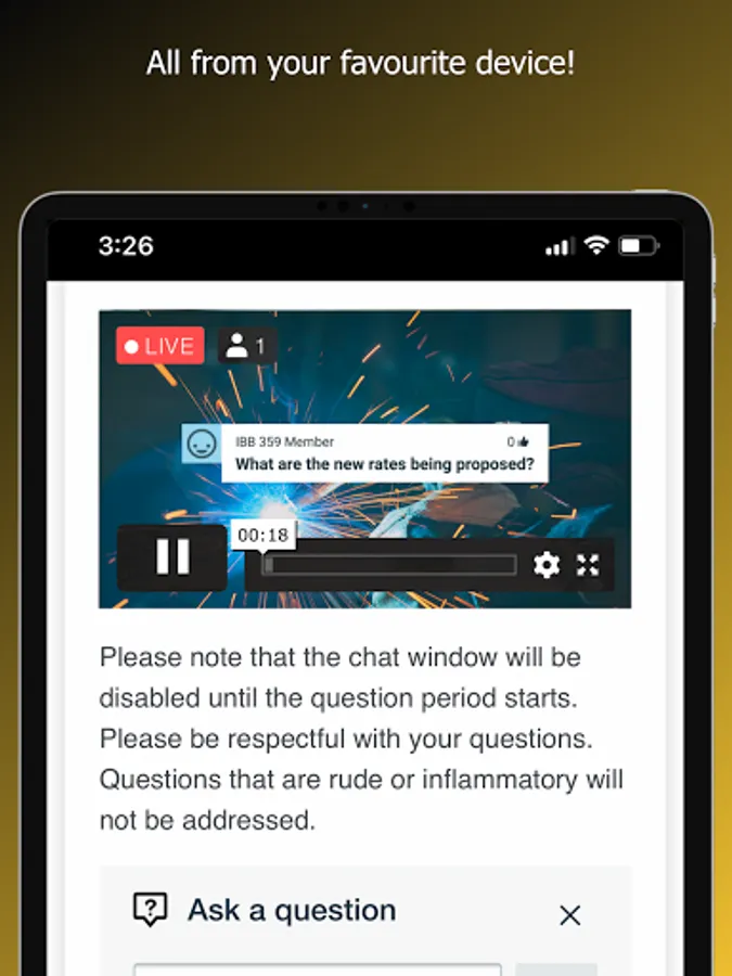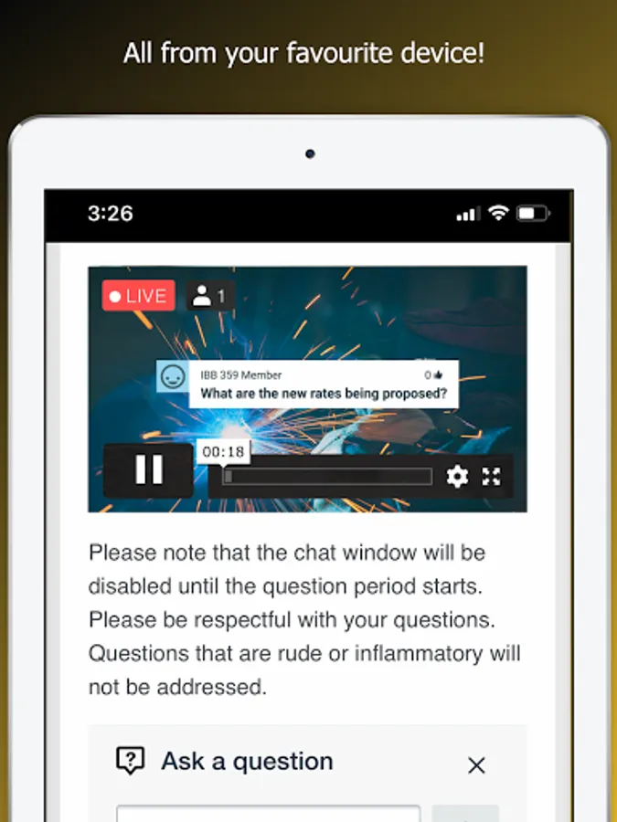 Keep up to date with your Union using the Boilermakers Local 359 live broadcast application. Watch live streaming business manager updates on your mobile device from the comfort of your home. Interact with your Union by asking questions and responding to polls.