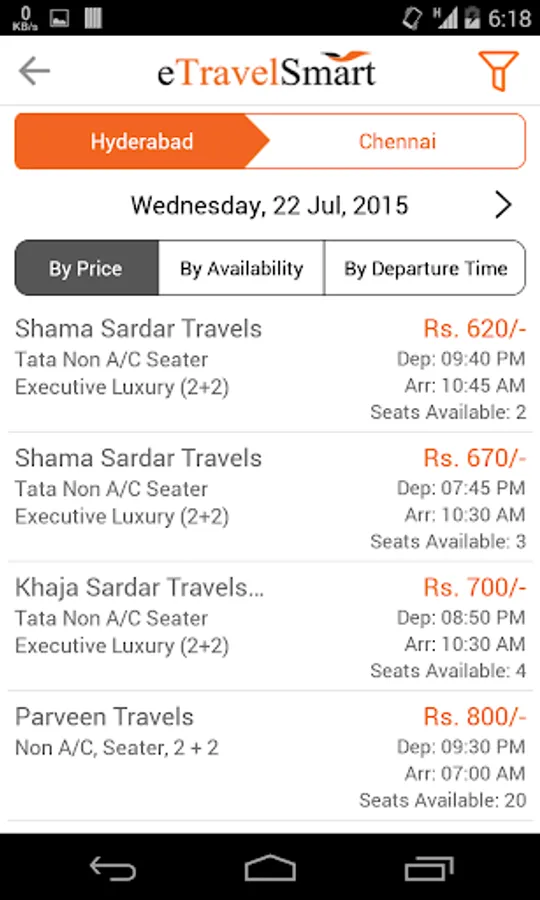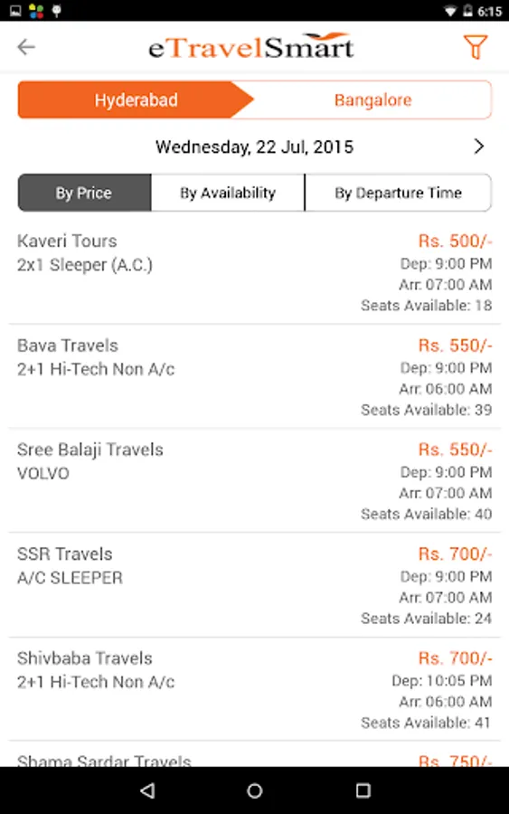 Our "Smart" technology helps passengers book bus ticket online among all famous destinations across India with just few simple clicks.Passengers are able to find a wide range of Smart filters which enable them choose Bus operators (SVR,VRL,Orange tours and travels,SRS,KPN, Neeta Travels, Kallada, Kesineni, Sharma Travels, HKB, Sangeetha, SRM, Seabird, Hindusthan,KALESWARI TRAVELS, Paulo, Rathimeena, Sharma, Sree Kaleswari, Universal, Kaveri, Morning star, Greenline, Prasanna,Uttar Pradesh State Road Transport Corporation(UPSRTC), Hebron, Hans, Vivegam, National, A1, Roadlink, Meghana, Patel, Konduskar, Jabbar & many more), Type of Bus (seater, sleeper, semi-sleeper,A/C, Non A/C, and Volvo), Ticket Fares, Boarding Points, Dropping Points, etc.