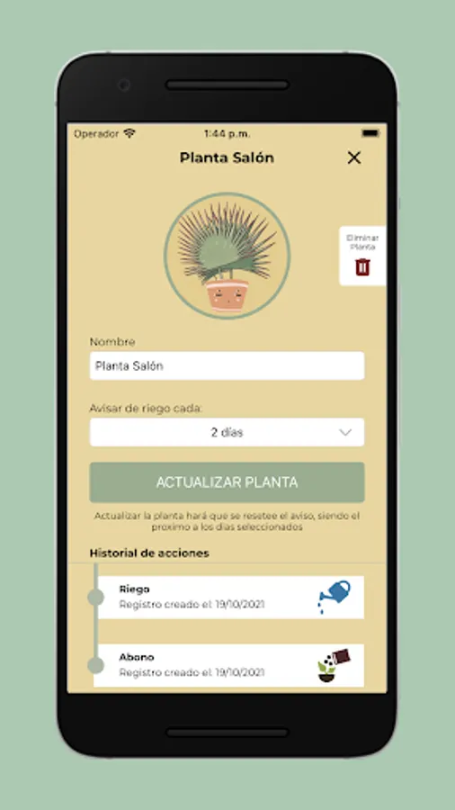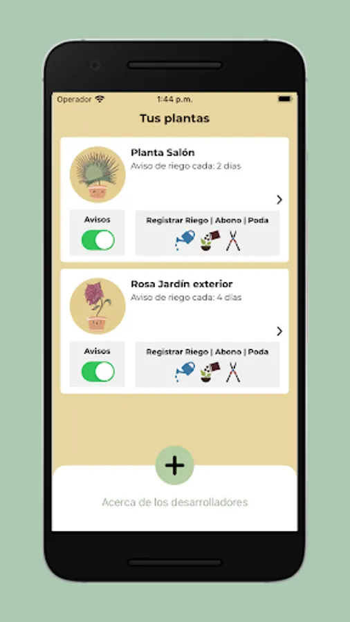 With this app you can configure and schedule reminder alerts for watering your plants. Select a name for your plant such as "Rosa del Salón" and the frequency of notifications you need. It also records when your plant was watered, fertilized or pruned to keep a clear and simple control.