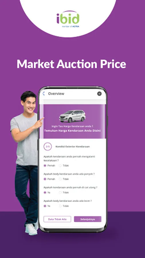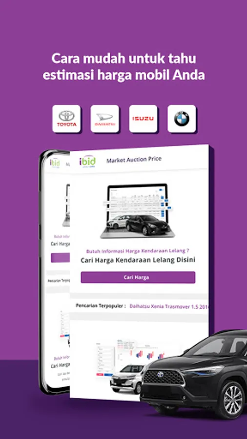 MAP contains tens of thousands of price lists formed by used car auctions of various brands, types, types, and years which are sold at auction by IBID-Balai Lelang Serasi. You only need to enter your vehicle data in this application and get an overview of the price of your car easily.