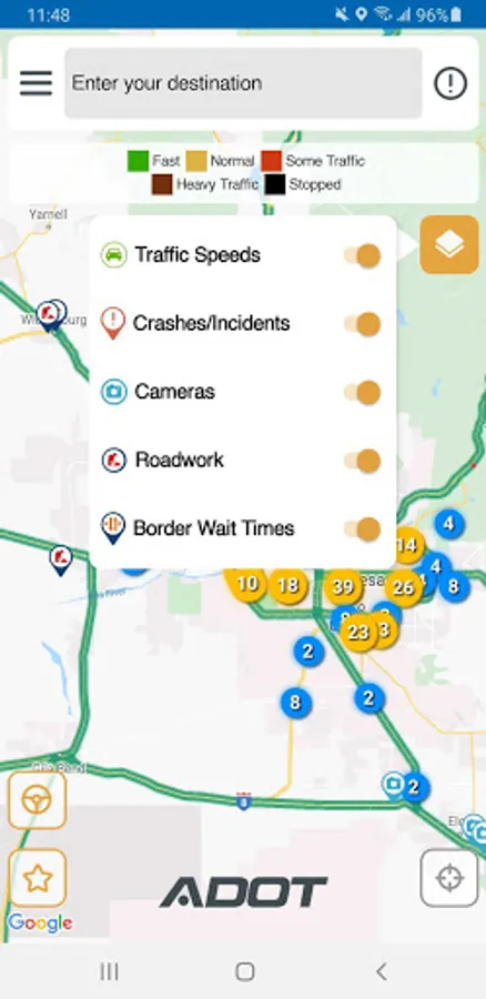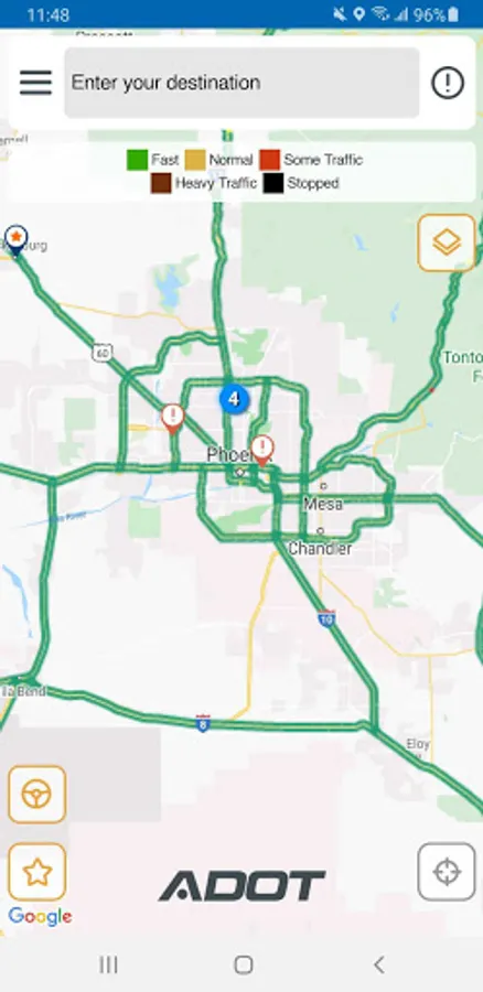 AZ511 works in conjunction with the Arizona Department of Transportation's AZ511.gov, the Arizona Traveler Information website, to provide the latest information on conditions along the state highway system. Users will receive information on delays, crashes, construction and closures, as well as alternate routes to help drivers avoid backups. Motorists may view ADOT's statewide network of cameras on the app. Drivers can get real-time information on their routes by entering their destinations into the app. Travelers may also save regularly used routes and receive alerts along those routes.