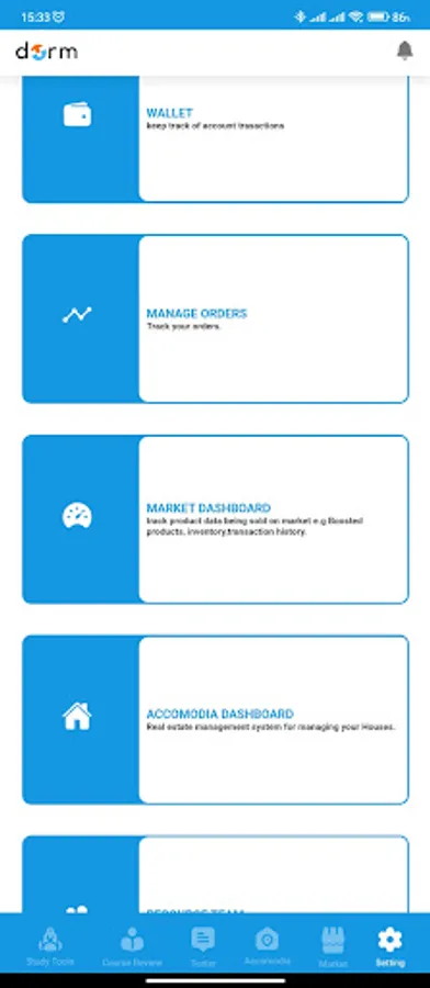 Designed with students in mind, the dorm platform offers them resources like Texter, which sends free SMS, Accomodia, which lets them rent or buy homes, Market, which lets them trade products and services with other users, as well as Study tools like the library and cbt test environment.