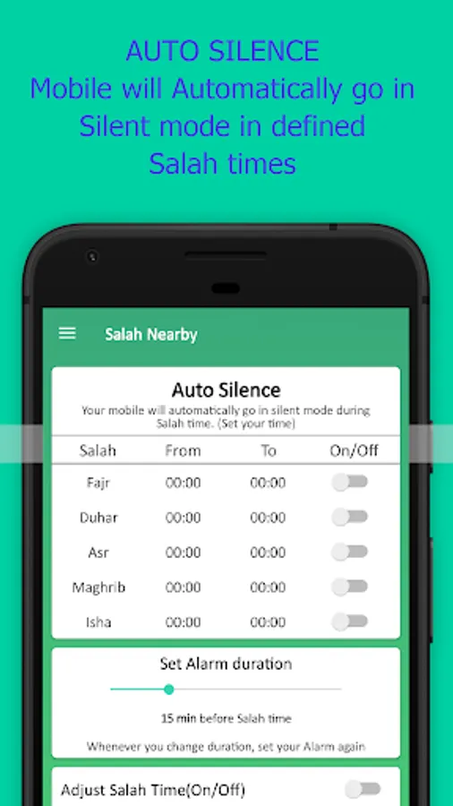 4. AUTO SILENCE: Set your salah times, and Mobile will automatically switch to silent mode (AUTO SILENT)