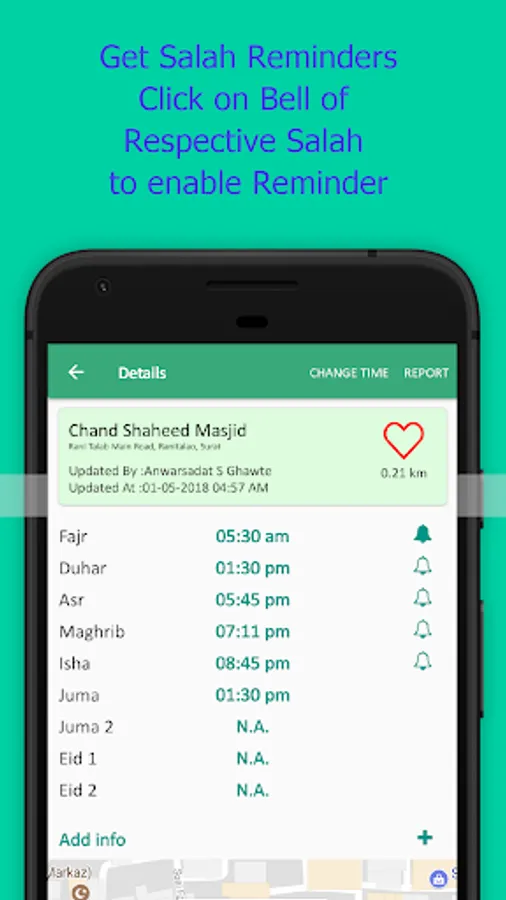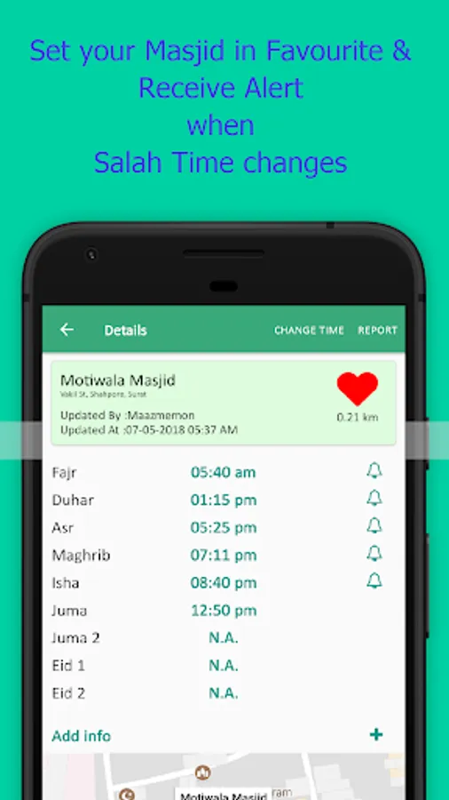 2. Receive NOTIFICATION (ALERT) if Salah time (Prayer time / Namaz time ) of your favorite masjid changes