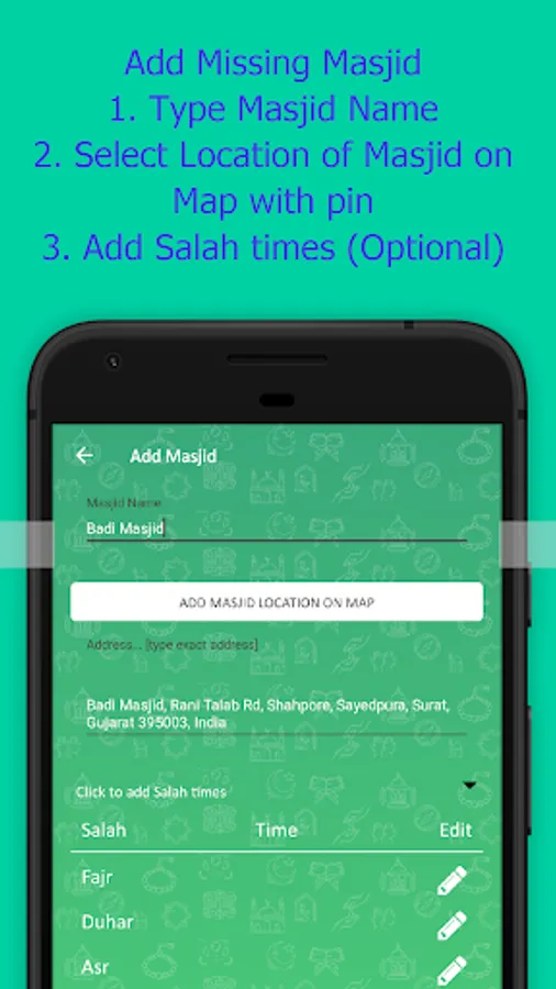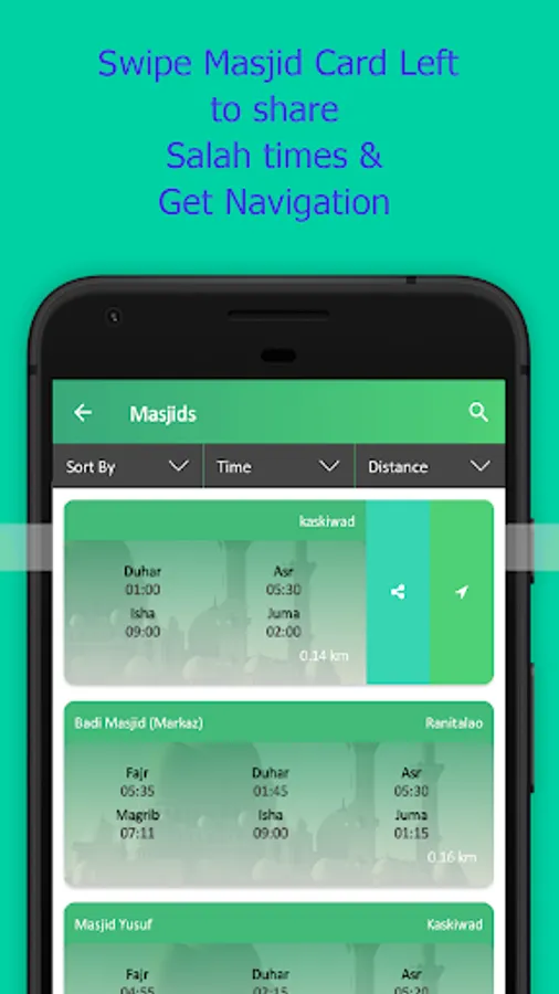 Wherever you go just use this app to find masjids around you. Every registered member can keep Salah timings updated. Help each other to offer Salah on time in masjid and be a part of noble cause