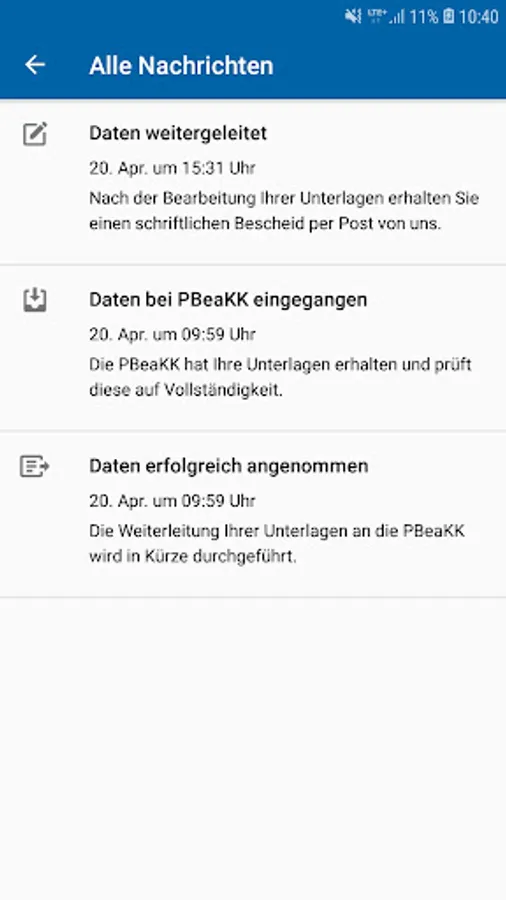 In addition, you will receive a forwarding confirmation and a confirmation of receipt in the app. We will then check whether the documents you have submitted are complete and legible. We will notify you directly in the app of the current status of each submission - in the status overview: forwarding & storage, receipt & verification, start of processing or errors.