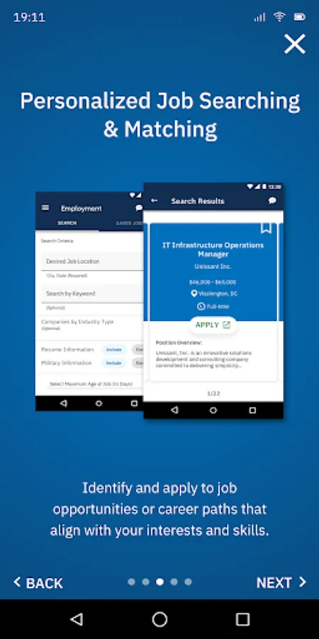 • An Employment module that personalizes job searching using Artificial Intelligence (AI) and our aggregator of 51,000 job sites to provide more than 198,000 new job opportunities daily from every business with a NAICS code across all industries. Features include helping you create an employment profile consisting of your Occupational Specialty Code(s), resume, desired job location, and industry type(s). Our Digital Assistant is trained to surface employment resources including help creating a resume and cover letter, preparing for an interview, and job searching tools.