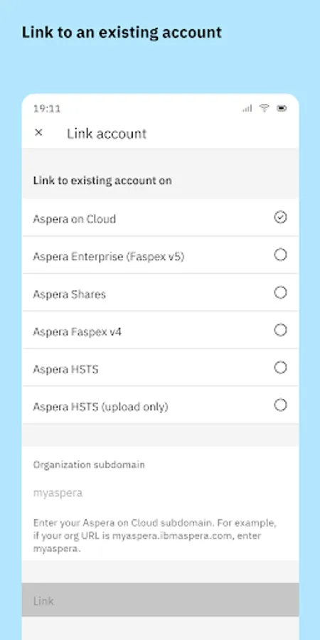 You can link to your accounts on IBM Aspera High Speed Transfer Server, Faspex 4 or 5, and/or IBM Aspera on Cloud.