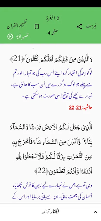 یہ دراصل مولانا ابو الاعلیٰ مودودی رح کی تفہیم القران app ہے. یہ انٹرنیٹ پر موجود دیگر قرانی سافٹ وئیرز سے کئی حوالوں سے بہتر پرگرام ہے. آپ کسی بھی قرانی سورہ کو کھول لیجیئے اور تلاوت کے بعد یا پہلے ترجمہ پر کلک کردیجیئے. صاف اور آسان ترجمہ آنکھوں کے سامنے آجائے گا. اگر ترجمہ پڑھتے ہوئے کسی بھی آیت کو سمجھنے میں مشکل درپیش ہو تو ہر آیت کے ساتھ سرخ رنگ میں دیئے گئے حوالہ عدد کو کلک کردیجیئے. لیجیئے جناب ! فوری طور پر مولانا مودودی رح کی اس آیت سے متعلق مختصر تشریح آپ کے سامنے آموجود ہوگی-