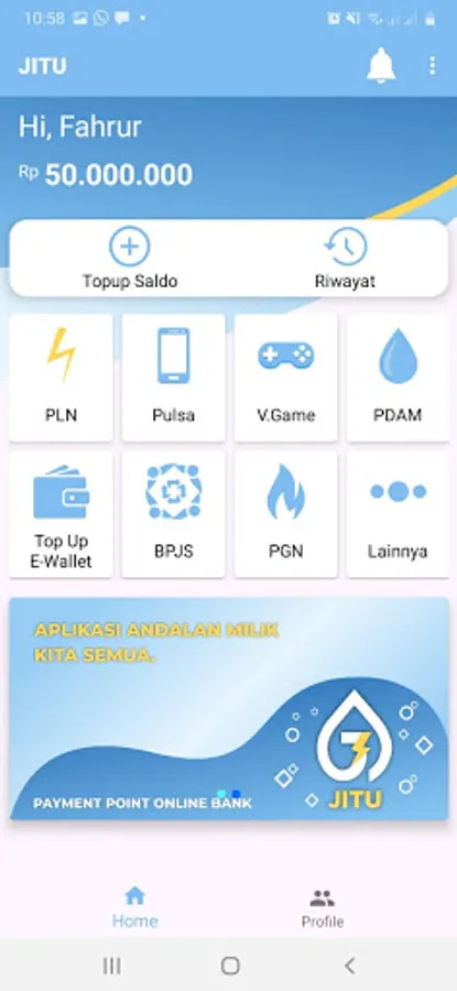 Jitu android application is a free mobile application for Jitu loyal members wherever they are. This application makes it easy for you to make various transactions such as topping up credit, purchasing electricity tokens, paying postpaid bills, purchasing game vouchers, topping up e-wallets, etc.