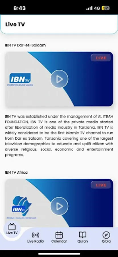 This platform allows you to watch IBN TV DAR ES SALAM, IBN TV AFRICA and listen to MAARIFA RADIO from its Telivision and Radio studios based in Tanzania