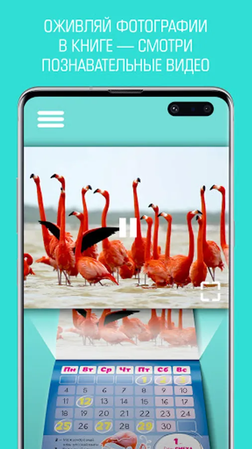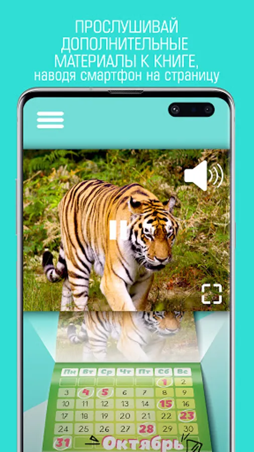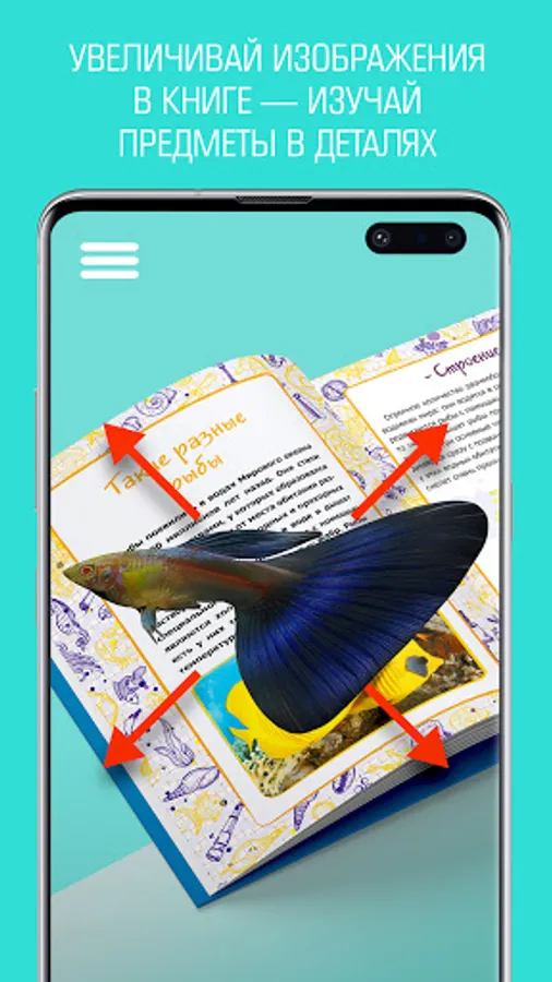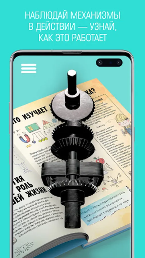 Augmented reality technology places additional information on the pages of books: 3D, video, audio, text. There is also a function to increase and decrease the playback screen. The application allows you to take a photo or video and share it with your friends.