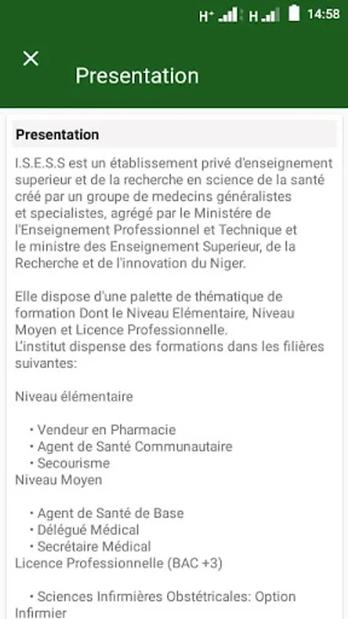 Isess Niger is an app that gives information pertaining to the Higher Institute in Health Science.