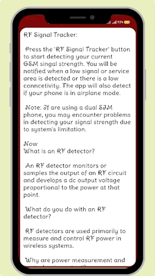 It is essential to know the RF output power because the application specifies it in most cases, and certain maximum values must not be exceeded according to Federal Communications Commission regulations. In many cases, the transmitter power is controlled automatically. As a result, the output power is measured and compared to a set point level in a feedback control circuit so power can be adjusted as required. in RF Signal Detector you have features like : Network operators, Sim operator, phone type, network type, network strength in dbm and ASU, data state, data activity, country code of the mobile phone and Device Id. Radio frequency (RF) is a measurement representing the oscillation rate of electromagnetic radiation spectrum, or electromagnetic radio waves, from frequencies ranging from 300 GHz to as low as 9 kHz. WiFi network access points identified, Radio frequency refers to an oscillation rate of an alternating electric current or voltage or of a magnetic, electric or electromagnetic field or mechanical system in the frequency range from around twenty thousand times per second to around three hundred billion times per second.