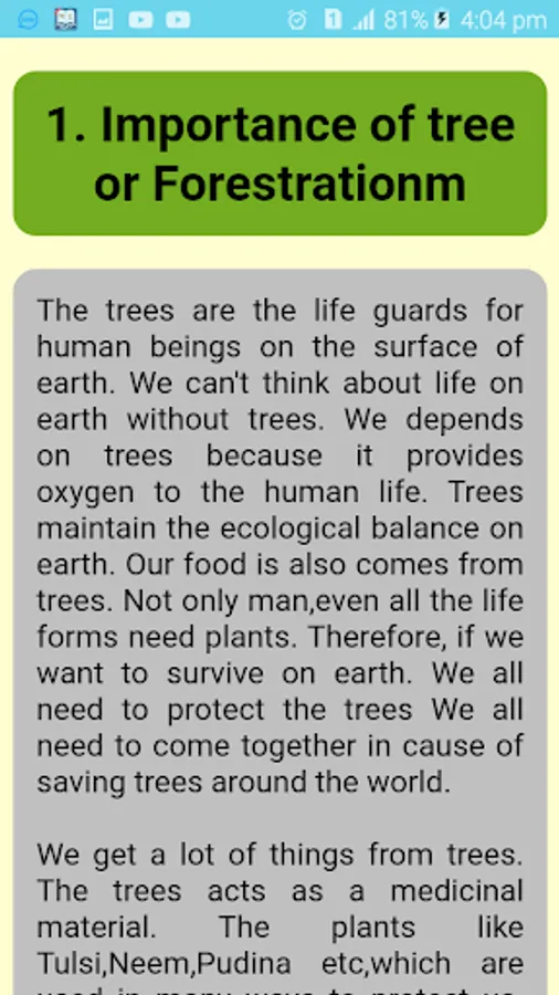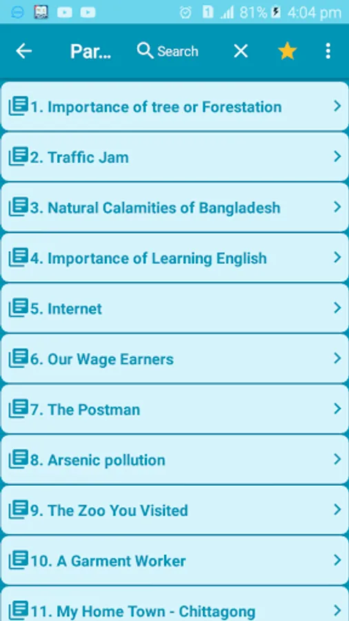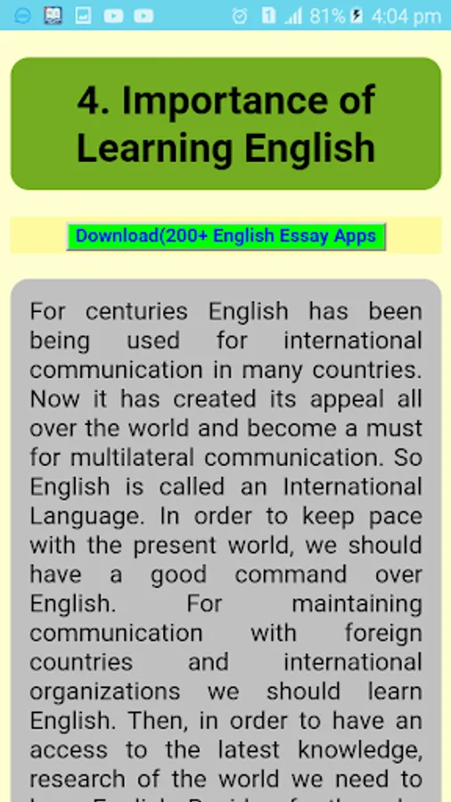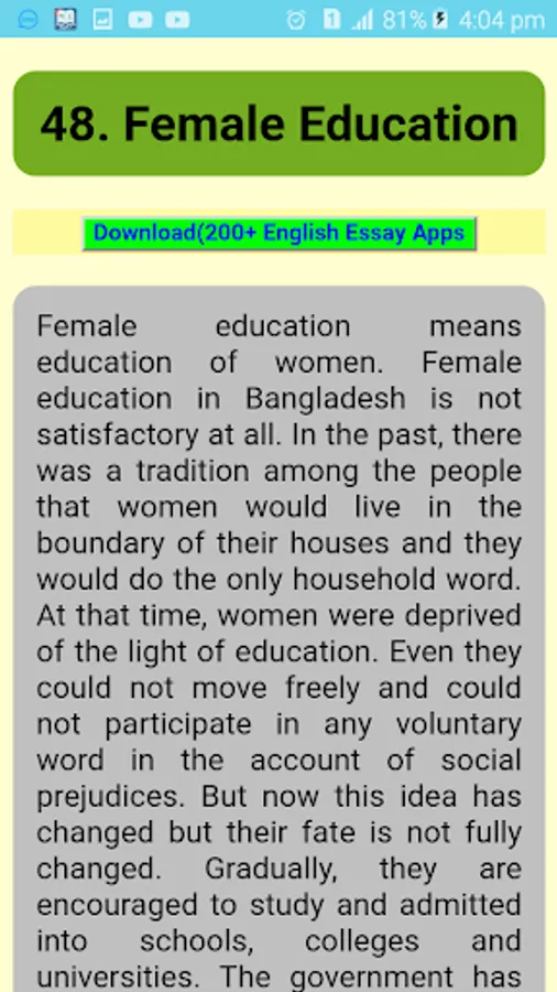 There are a lot of app in play store. but this app is more richest in content. In this application have more than three hundred seventy five English paragraph. At present each and every school and college there are a lot of English writing. So, paragraph also one type of English writing. To get all types of English paragraph you should keep this android application. So, please if you think this app is best for your, than don't forget to share with your friends and family.