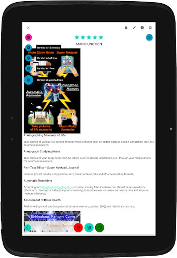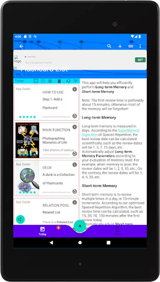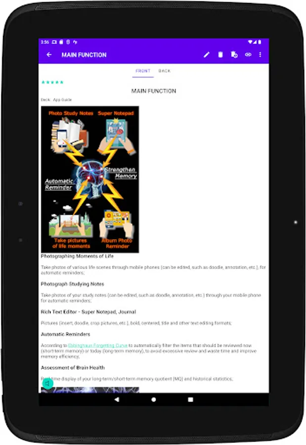 After years of research and development, we have integrated the advantages of dozens of popular memory applications, such as Spaced Repetition (SuperMemo2 algorithm) based on the Ebbinghaus Forgetting Curve, supporting Rich Text Editor (such as images, videos, sounds, hyperlinks, etc.), etc.