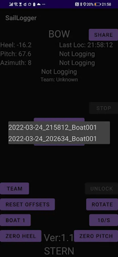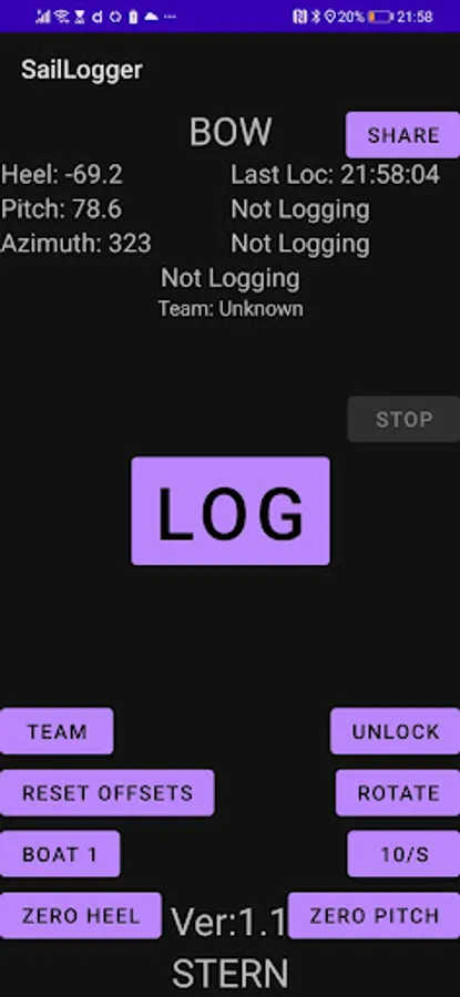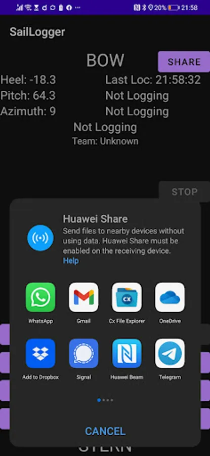Logging sailing session. Provides CSV file which includes GPS position, speed, heading, course over ground.