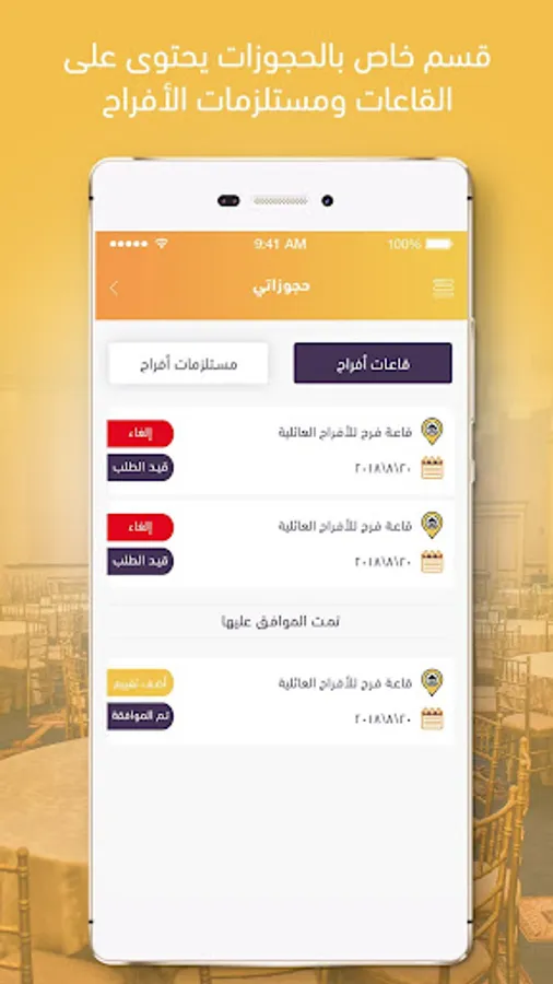 You can correspond to the owner of the hall immediately without delay and the exchange of media and voice messages and documents and the site on the map within the application directly and there is a private conversation for the WAASAB for faster communication with the owner of the hall and wedding accessories and add accounts of social networking sites Facebook, Twitter and Instagram.