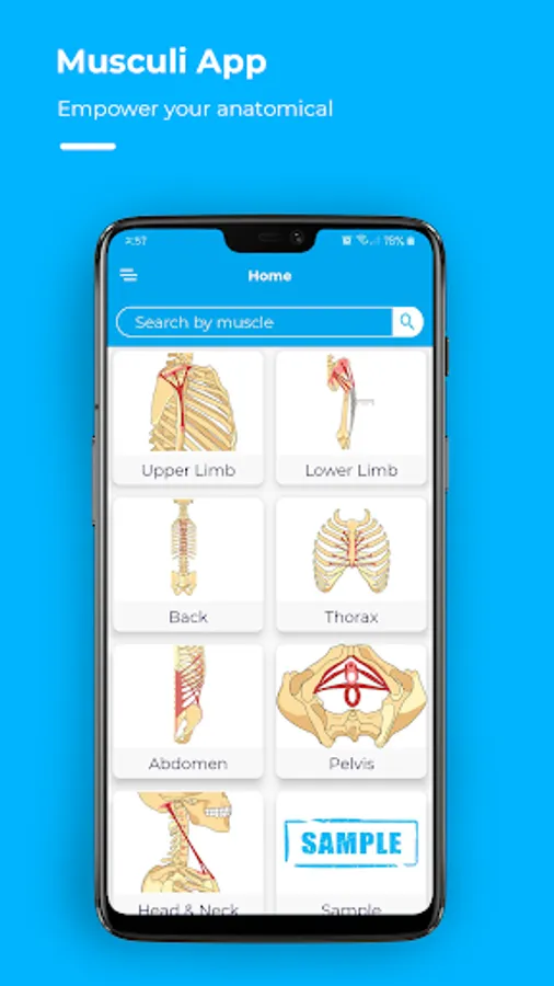 MUSCULI displays all skeletal muscles of the body regions (Head & Neck, Upper limb,
