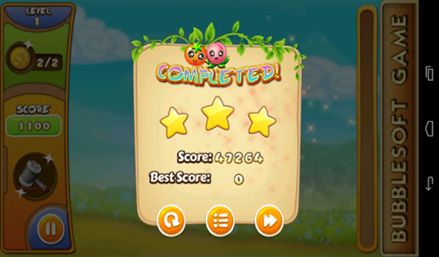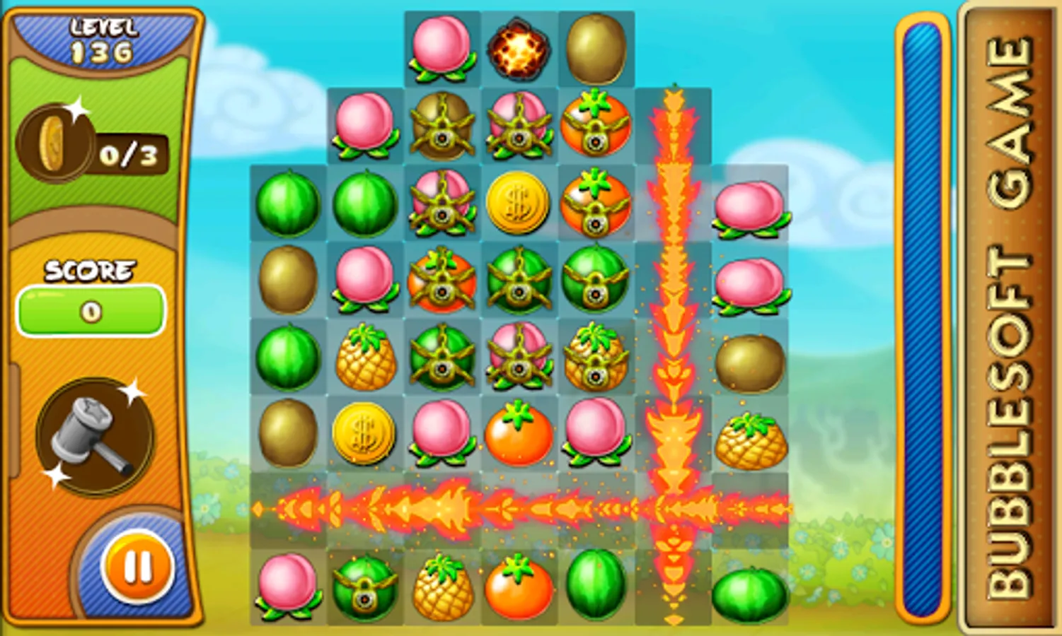 4.Eliminate 4 or more fruits to gather energy.Full the slot to win hammer,then bomb,then ray,then fire,This can help you win levels quickly.
