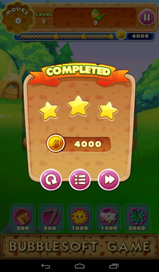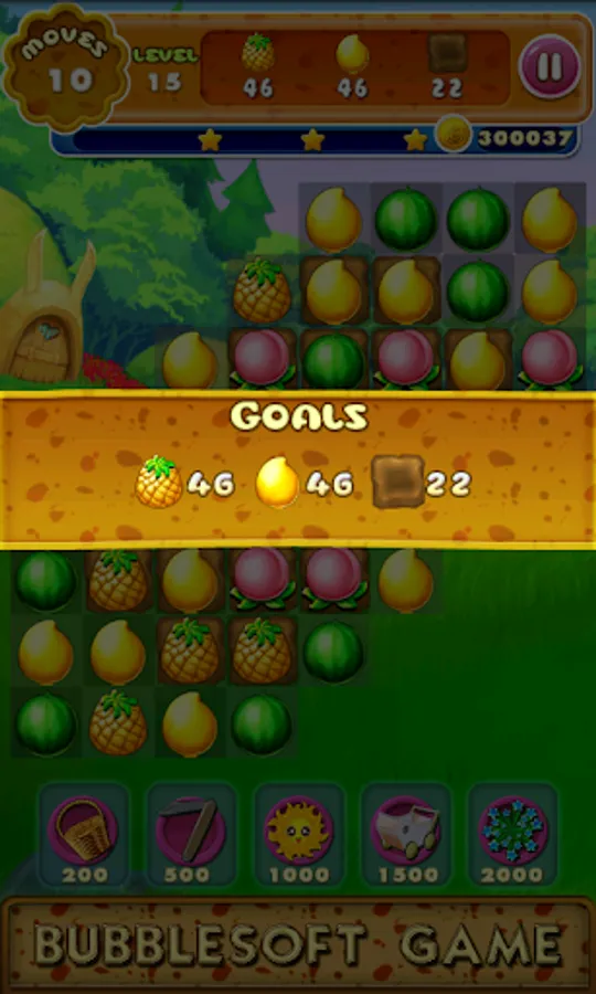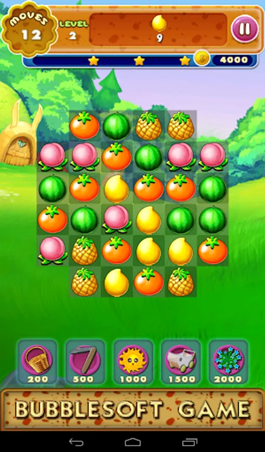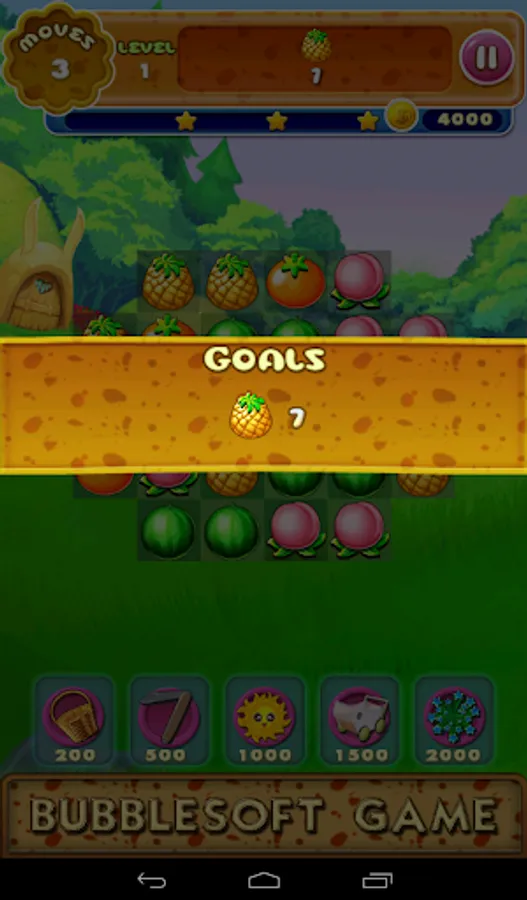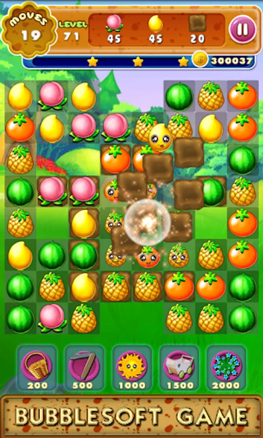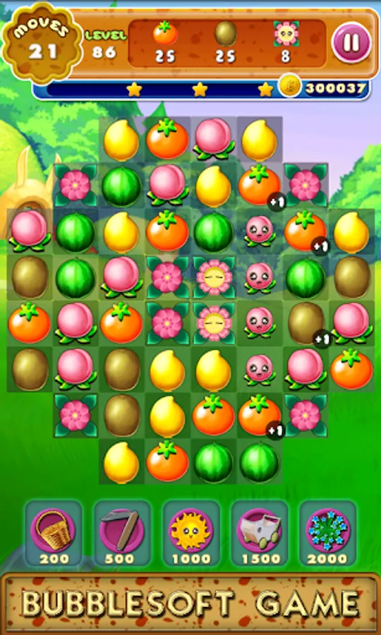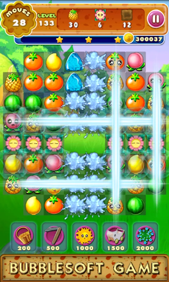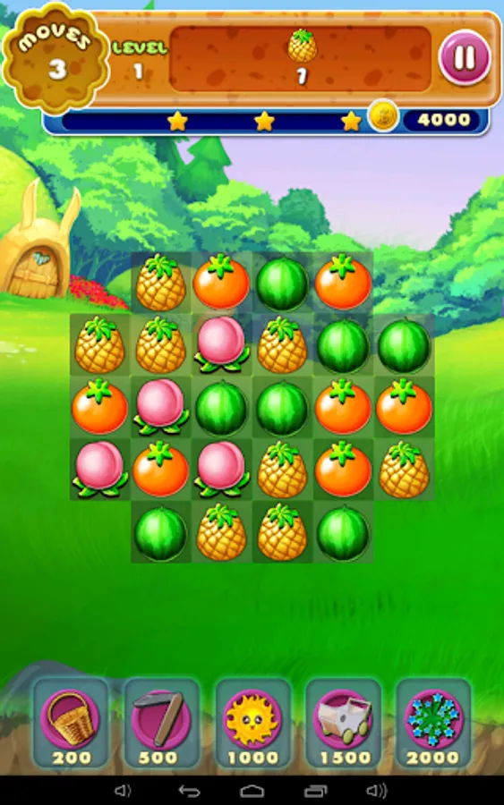 1.Switch the adjacent fruits,Make 3 or more with the same type together to eliminate them.Collect cute crops mixed with fruits and flowers showed on the top to win the levels before you run out of moves.And the mud bellow the fruits will be collected too.
