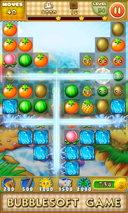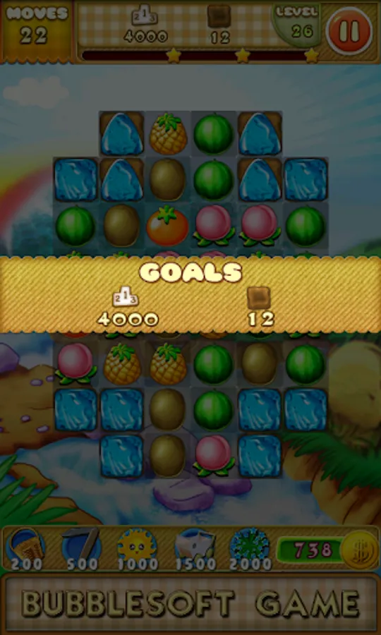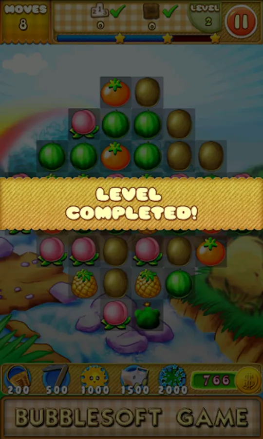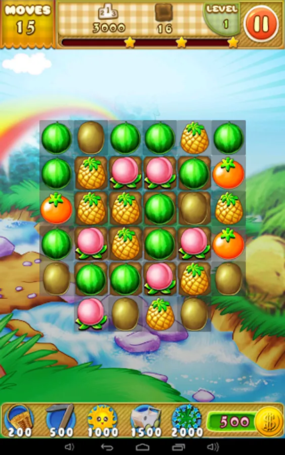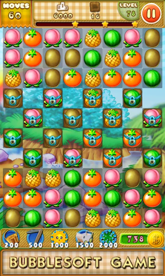 Switch the adjacent fruits.Make 3 or more with the same together to eliminate them.The backplanes will be eliminated too.Complete the goals showed on the top to win the levels before you run out of moves.
