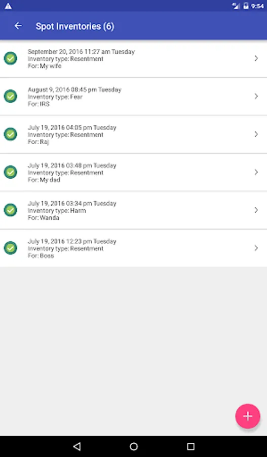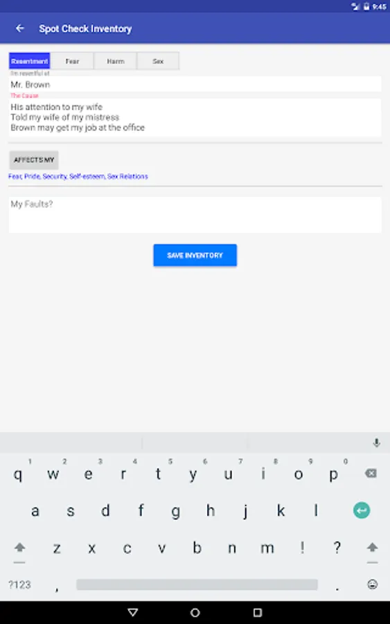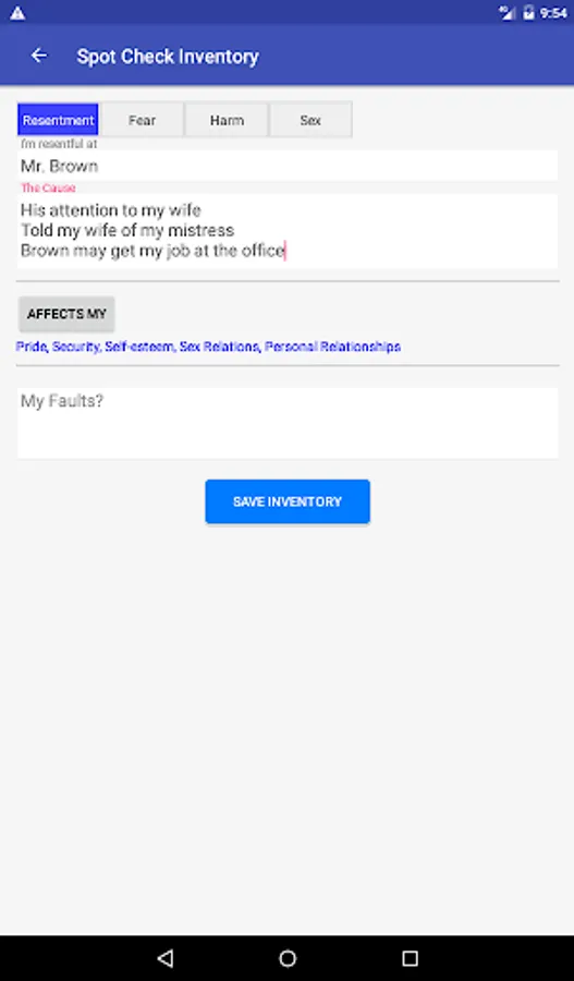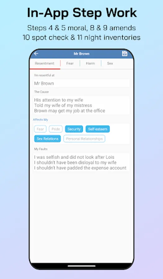 • Steps 4 & 5 inventory tool to create different inventories based on the big book style - 'resentment, fear, sex and harms done'.