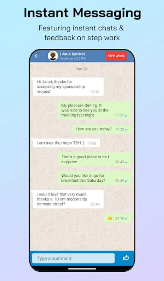 Join over 450,000+ sober Alcoholics Anonymous members and 11000+ sponsors. Now featuring instant chat messaging.
