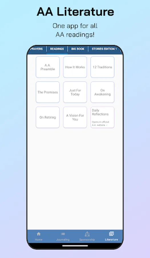 • Readings include - How it works, 12 Traditions, The Promises, Just For Today, on awakening, when we retire, a Vision For You