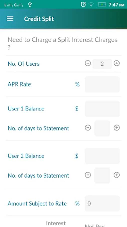 Use MoBill Split to easily split by entering the bill details with base plan charges, user charges, device charges. It automatically calculates the individual share of each user. If you have a credit card transaction to be split between family and friends with interest rate, it will let you know what each user share is based on the no.of days that transaction was charged to credit card.