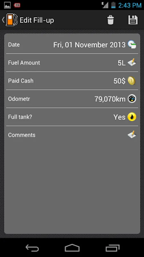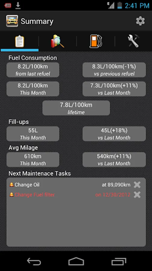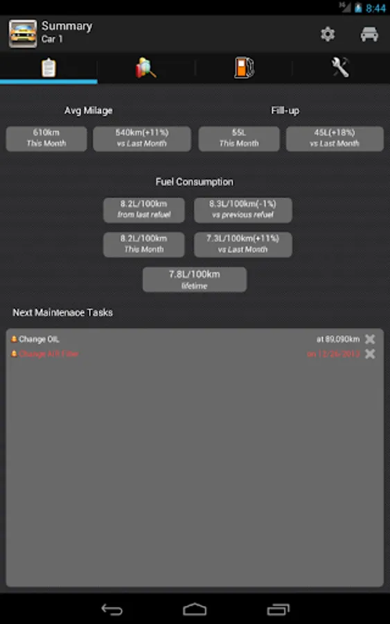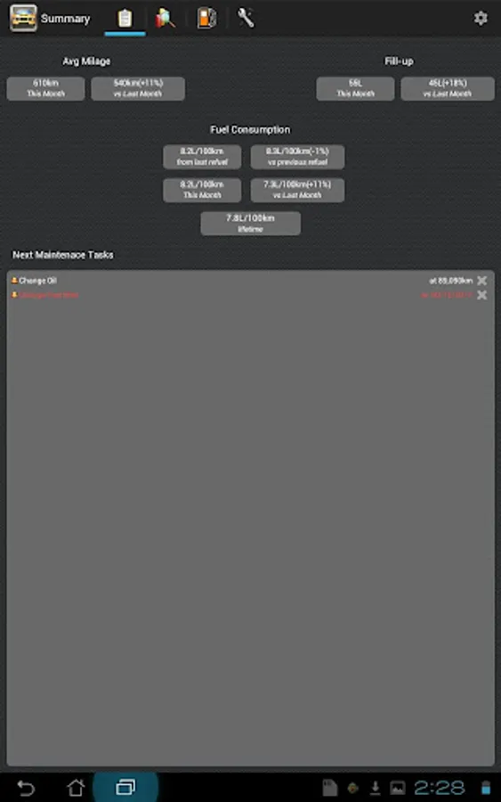 The best application created especially for your car! By downloading this app you’ll receive two in one: convenient program to track you car fuel consumption as well as detailed tracking of all maintenance/repair tasks. Now you will never forget to change oil or any other service task for your car since program reminds you on this with help of automatic notifications. Detail fuel consumption tracking functionality will inform you when something is wrong with your car and consumption of fuel increase.