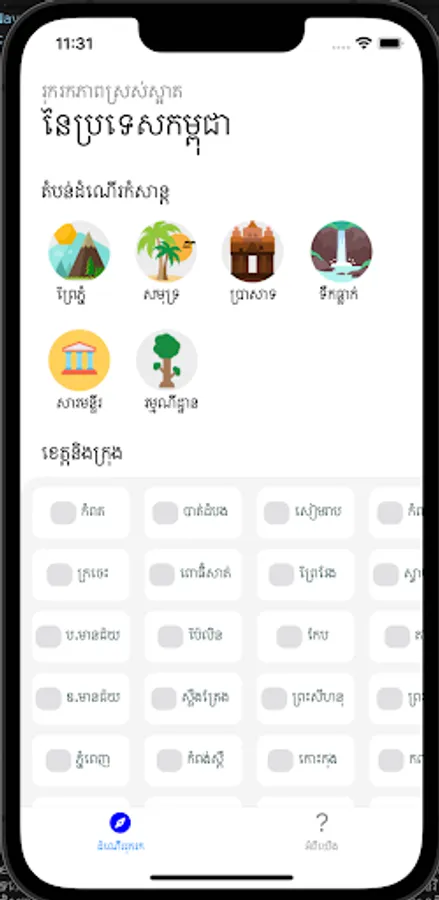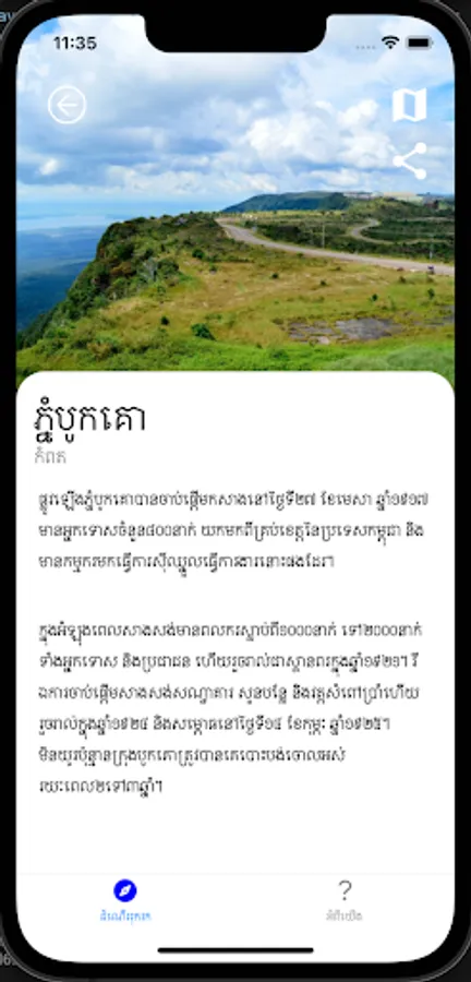 មគ្គទេសន៍ provide you different type of places to visit like sea, jungle, temple etc. If you wanna visit somewhere or some type of place and don't know where, just visit មគ្គទេសន៍. It will give you the information you need.