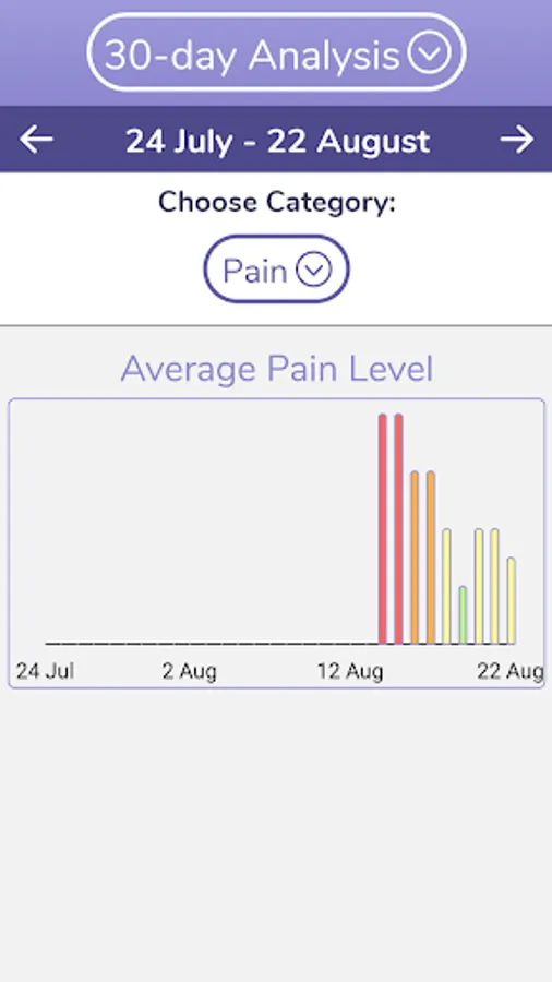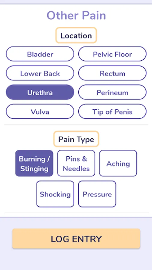 •Stress – Stress levels certainly influence pain and urinary symptoms. The app asks about your stress level so that you can see, over time, how your symptoms may change.