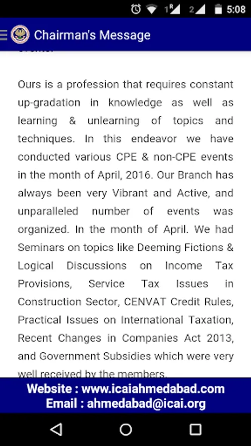 The ICAI Ahmedabad's mobile application brings you up-to-date key contents from its website http://www.ahmedabad-icai.org/ & http://www.icaiahmedabad.com/ like Events for Members, Events for Students, Photo Gallery, Study Material, Know your Branch, & Chairman's Message etc. This application is designed & developed for Android Devices. ICAI stakeholders may download mobile application and start using it without any additional cost anytime, anywhere.
