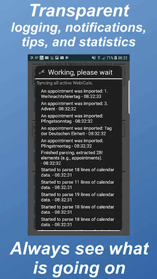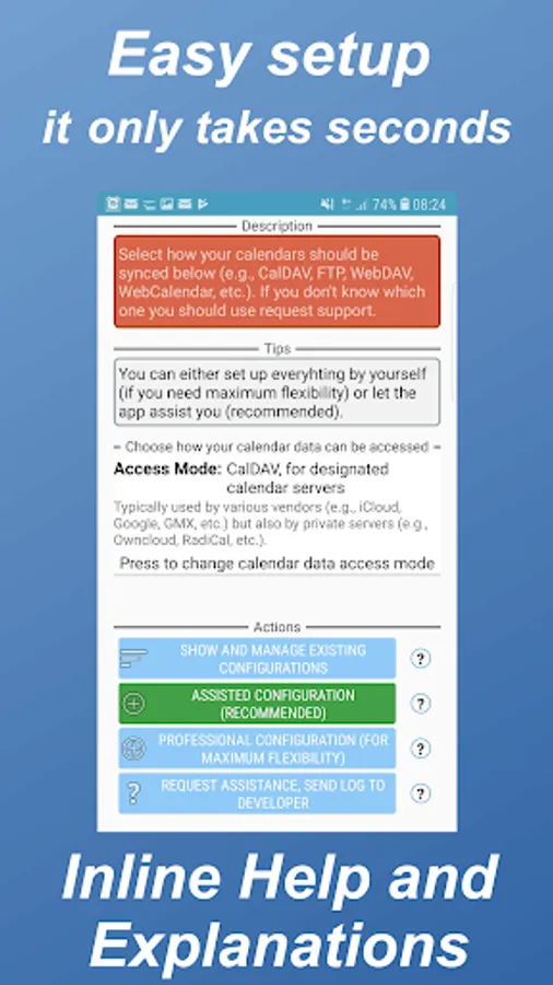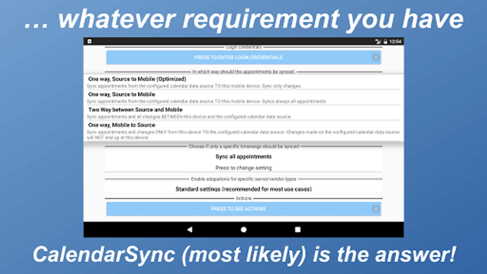 ⊛Flexibility - There are already appointments stored on the device which should be pushed to the server? You need individual sync intervals for each of your calendar data sources? You want to exchange appointments between multiple servers and sources? No worries, this and more is possible!