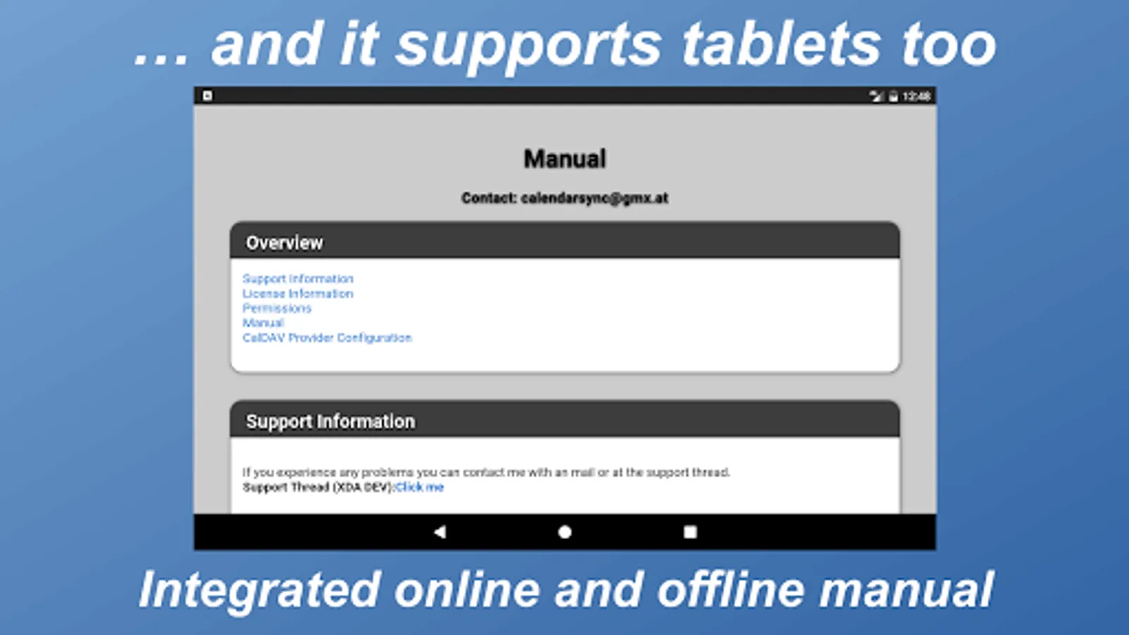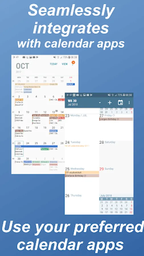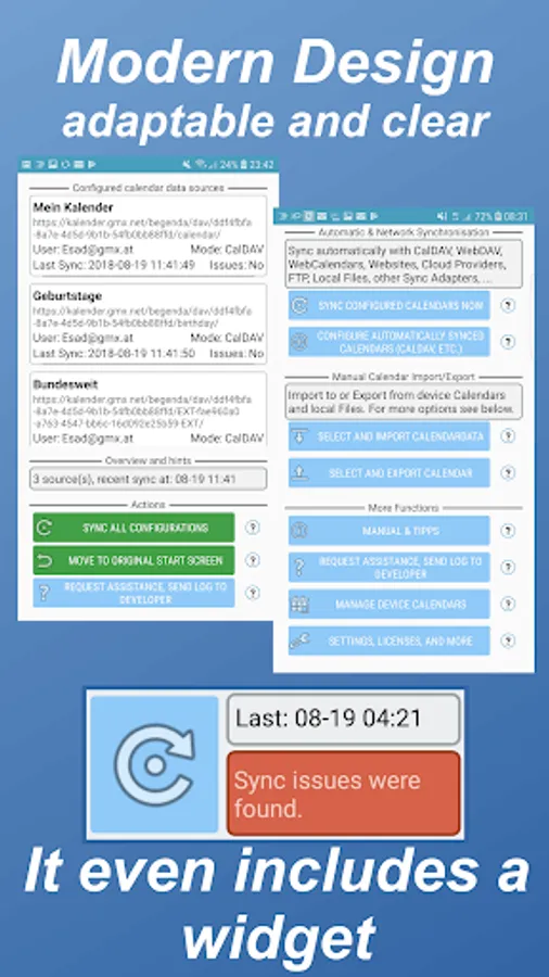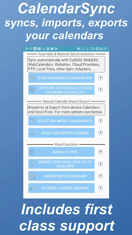 ⊛Syncs with many different sources - CalDAV, WebDAV, FTP, HTTP, WebCal, Cloudstorage, Local files, Between multiple Device Calendars, Mail attachments and many more. Of course, it also supports encryption and two way sync