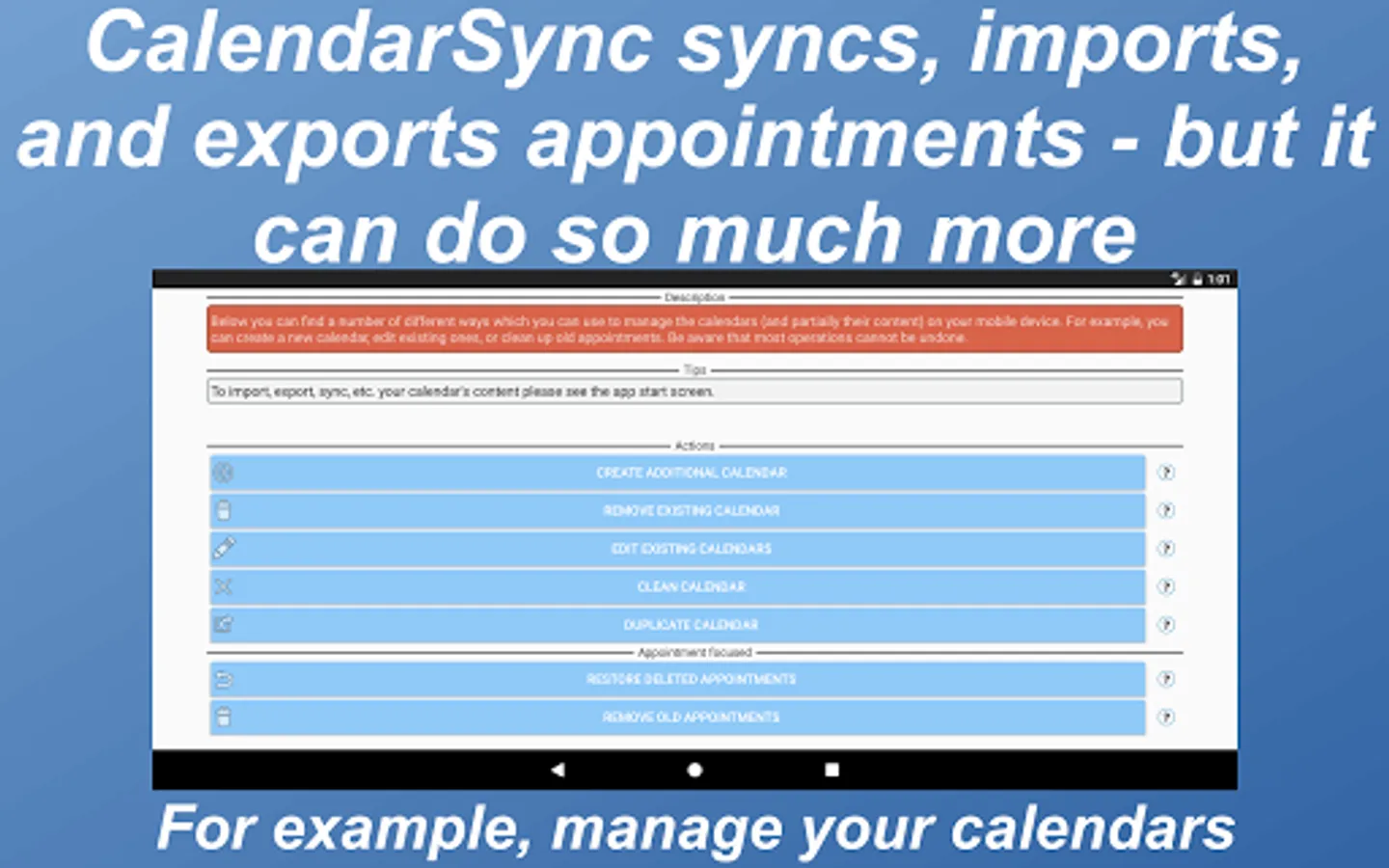 CalendarSync syncs your appointments with CalDAV, FTP, HTTP, WebDAV servers, Cloudstorage, between calendars on your device, or with local files (stored on the device or e.g. as a mail attachment). A quick overview on the most important features is given below.