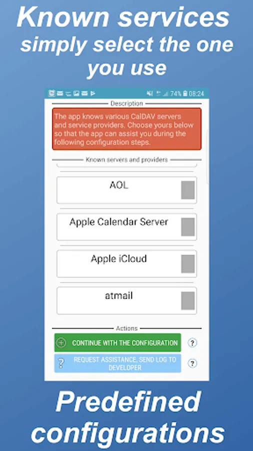 The app has been successfully tested with more then 50 different CalDAV Servers like Owncloud, Apple iCloud, Zimbra, OSX/iCal Server, eGroupware, GMX, Oracle Beehive, david.fx, Synology NAS, DAViCal, SOGO... You can find an overview here: http://ntbab.dyndns.org/apache2-default/seite/caldavprovider.html