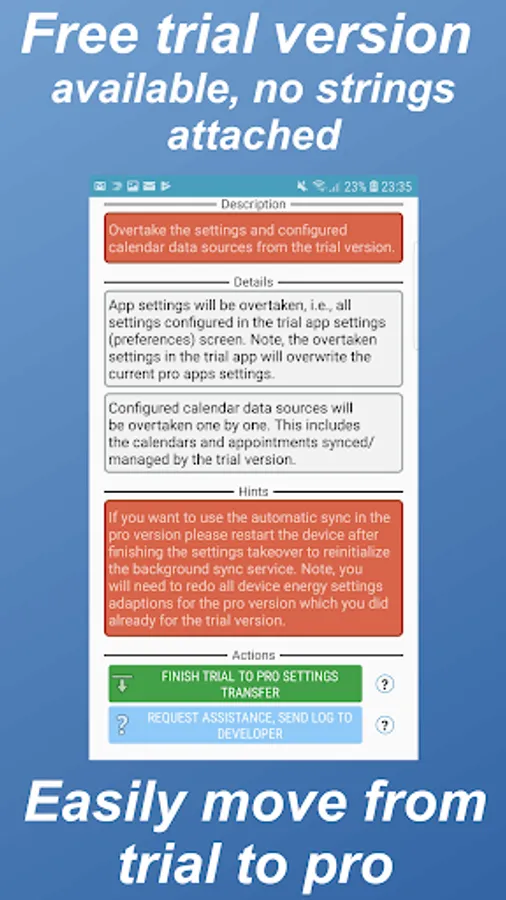 Do you want to check out the app for free? You can test the app and all its features without any limitations for two weeks. Simply install its free trial version from https://play.google.com/store/apps/details?id=com.icalparse.free