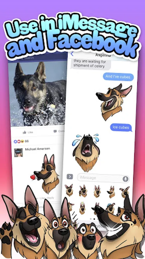 Express your love for the best breed in the world with these cute and colorful stickers, created by professional cartoon style graphic artists! View and send them via text message, and also in ANY social media application that allows you to use photos. Made by GSD lovers - for GSD lovers. ( We have 3 fur babies ourselves )