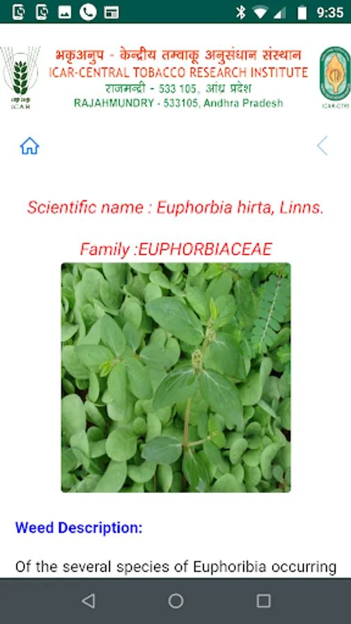 The second module ‘SHARE’ provides hyperlink to CTRI website for accessing. ‘CONTACT’ module provides contact details for receiving suggestions given by the user, if any. The module ‘ABOUT’ provides the general information like vision, mission, mandate, and Research programmes of CTRI. In addition to this, the communication bar on top left corner provides the information ‘about FCV tobacco’ and ‘Weed management’
