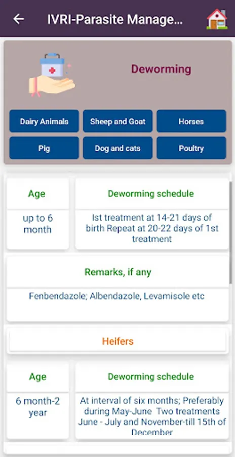 The application also provides insight to the deworming schedule and drugs which can be used along with their dose and dosage.