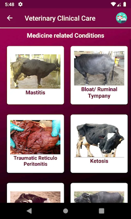 most frequent clinical conditions encountered in field conditions related to medicine (Mastitis, Bloat, TRP, Ketosis, Milk fever, Ruminal impaction & Calf diarrhoea), gynaecology (Pyometra,
